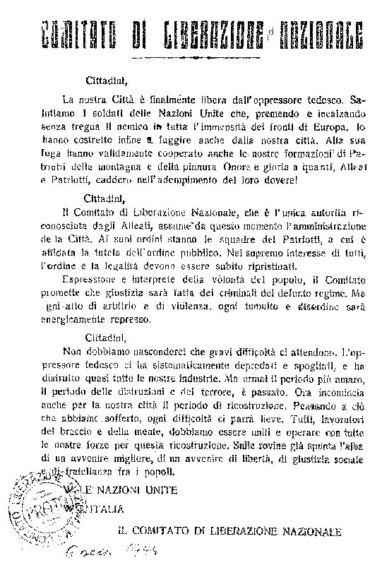 Il Comitato di Liberazione Nazionale, che è l'unica autorità riconosciuta dagli Alleati, assume da questo momento l'amministrazione de la Città. Ai suoi ordini stanno le squadre dei Patriotti, a cui è affidata la tutela dell'ordine pubblico. Nel supremo interesse di tutti, l'ordine e la legalità devono essere subito ripristinati.