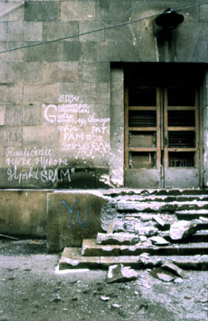 | portone lì vicino. I cetnici sparano sempre due granate per fare un massacro, la seconda serve a colpire i soccorsi. C'erano decine di morti e di feriti, la gente si lamentava chiedendo aiuto, i corpi dei vivi e dei morti erano mutilati e i pezzi sparsi sull'asfalto, é stato orribile. Poi mi sono ricordato che la mia famiglia sapeva che ero anch'io in quella fila e così sono corso a casa per rassicurarli che ero ancora vivo. |