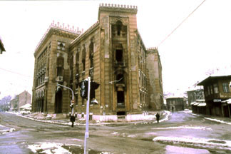 | Purtroppo i cetnici scorgono il movimento e aprono il fuoco sui bosniaci, i quali rispondono ingaggiando una piccola battaglia. Dal vicino presidio di Alipasno Polije giungono due veicoli carichi di territoriali, in supporto dei difensori del chiosco, la battaglia esplode violenta e, per oltre un'ora, la furia delle raffiche rompe il silenzio dell'alba. Un posto d'interposizione e osservazione dell'UNPROFOR, si trova nel bel mezzo del tiro incrociato dei combattenti. Poi, intorno alle H.06.00, inizia un intenso bombardamento della sede del giornale, che viene aggredita da una miriade di proiettili incendiari. Le due torri di dieci piani bruceranno per oltre dodici ore, per poi crollare entrambe, la sera stessa. Un enorme boato sgretola le torri, polverizzandole e facendo tremare le stesse fondamenta in cui é interrato il rifugio antinucleare. Superstite di quella giornata infernale, un mozzicone del palazzo si erge in solitudine, monumento alla libertà di stampa e alla resistenza umana. Solo quel giorno Oslobodzenje uscì in ritardo. |