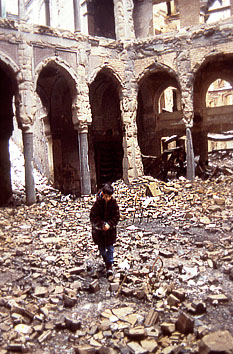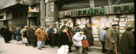 sono stati incendiati. Anche la sede delle poste e dei telefoni é stata bombardata, le linee telefoniche sono fuori uso. Il gas, la cui centrale é occupata dalle forze serbo-bosniache, non viene più erogato. I cavi elettrici sono caduti sotto i bombardamenti e i tralicci che li sorreggono sono stati minati intorno ai basamenti, in modo che nessuno possa andare a ripararli, la città é al buio. In mancanza di energia elettrica, l'acqua non può essere pompata all'interno delle tubature idrauliche dei palazzi, che sono a secco, i cittadini vanno a fare acqua in alcuni punti della città, da una cisterna, o dov'é stata attivata una pompa d'emergenza. Si creano così lunghe file di persone cariche di taniche vuote che aspettano il loro turno per approvvigionarsi della poca acqua che riescono a trasportare. L'attesa é snervante e pericolosa. Le scuole sono chiuse. Le sirene squarciano la vita della popolazione assediata. I bombardamenti sono quotidiani e costringono la gente nei rifugi. I cecchini, attivi dovunque, mietono ogni giorno molte vittime. I feriti affollano il pronto soccorso dell'ospedale Kosevo. La situazione alimentare é sempre più drammatica. |