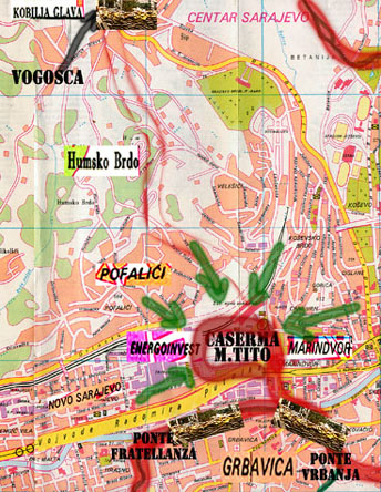 | Cinque carri scendono dalla collina di Vraca verso Grbavica, seguiti dai blindati pieni di incursori. Escono da Grbavica proseguendo in direzione est, presso il ponte di Skenderja si dividono; due carri proseguono sulla via Dobrovolijacka (della Buona Volontà), che costeggia la riva sinistra della Milijacka. Mentre gli altri tre carri si apprestano ad attraversare il ponte di Skenderja, alla volta del vicino palazzo Presidenziale. Obbiettivo dell'azione é il quadrato tra i due ponti, quello di Skenderja e quello di Dva Ribara (dei Due Pescatori). Quadrato che contiene la Presidenza, il palazzo del Comune, il Comando delle Forze Speciali Antiterrorismo, il palazzo delle Poste e Telefoni e la Banca Nazionale. Superando i due ponti, i carri chiuderebbero in una manovra a tenaglia l'obbiettivo, bloccando la strada principale e occupando, con le truppe d'assalto, le centrali di comando della resistenza. |